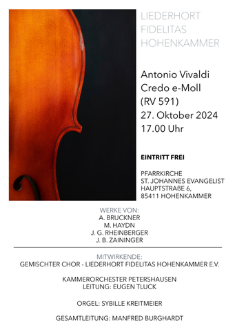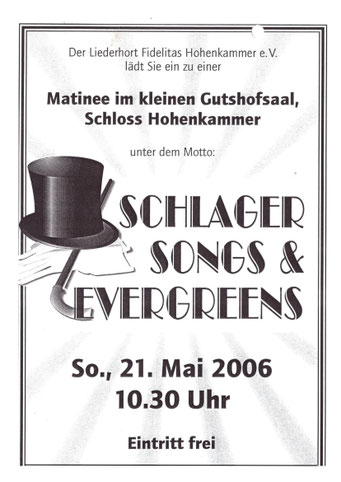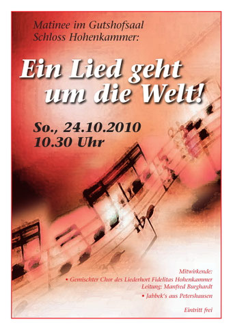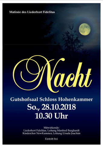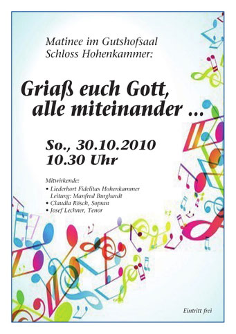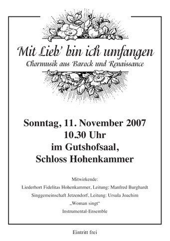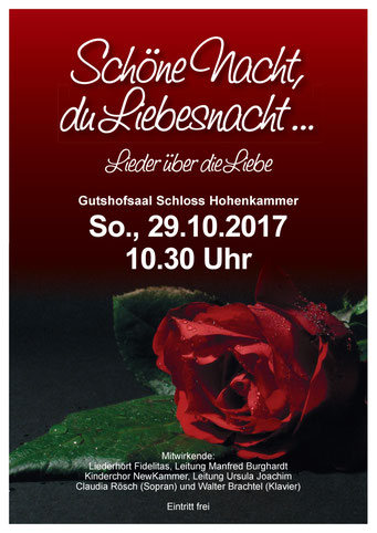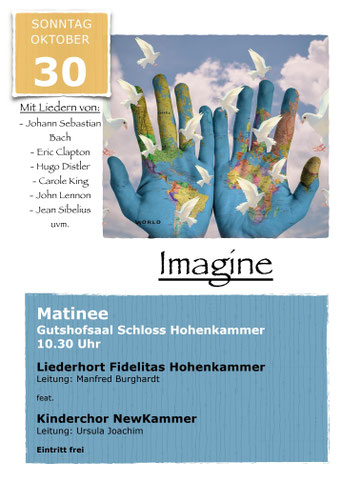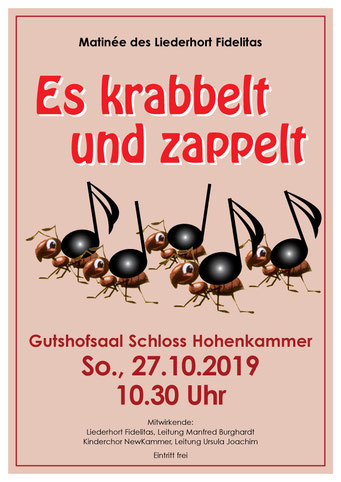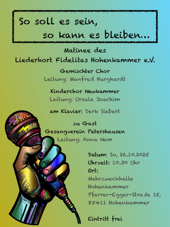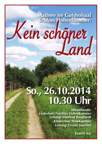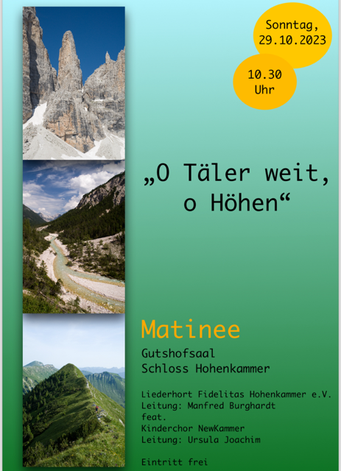 Bei der diesjährigen Matinee am 29.10.2023 nahmen die Newkammer unter Leitung von Ursel Joachim und der Gemischte Chor unter Manfred Burghardt das Publikum mit auf und über so manchen Berg, in Täler, auf den schönsten Wiesengrund bis auf die Insel mit zwei Bergen. Der volle Gutshofsaal im Schloß Hohenkammer erfreute die Mitwirkenden mit kräftigem Beifall.