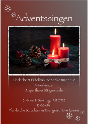Besinnlich wurde es am 17.12.2023 beim Adventssingen in der Pfarrkirche Hohenkammer. Der Gemischte Chor trat als Ganzes, als Frauenchor, Männer- wie Frauen-Dreigesang auf, dazu gab es instrumentale Begleitung. Zu Gast war die Amperthaler Sängerrunde aus Kirchdorf unter Leitung von Jakob Högl, die das Konzert mit ihren schönen Männerstimmen abrundete. Anschließend wurde gemeinsam die heitere Weihnachtsfeier im Sportheim Hohenkammer begangen.